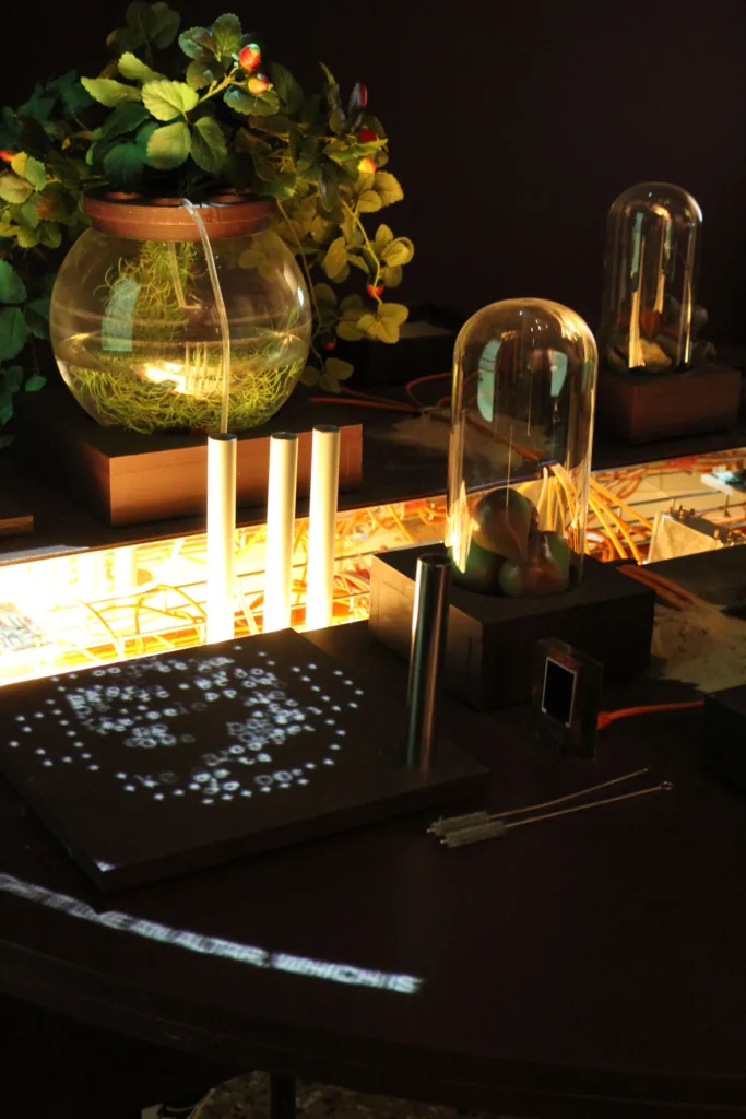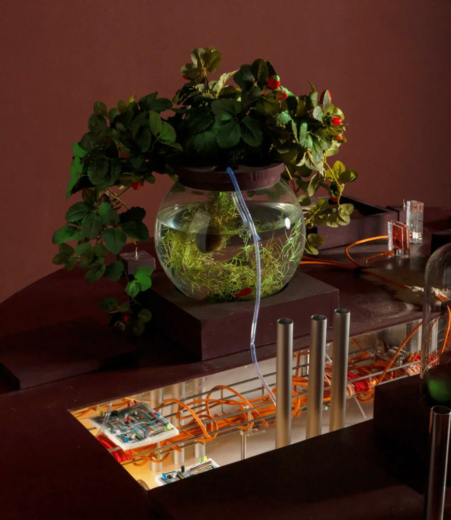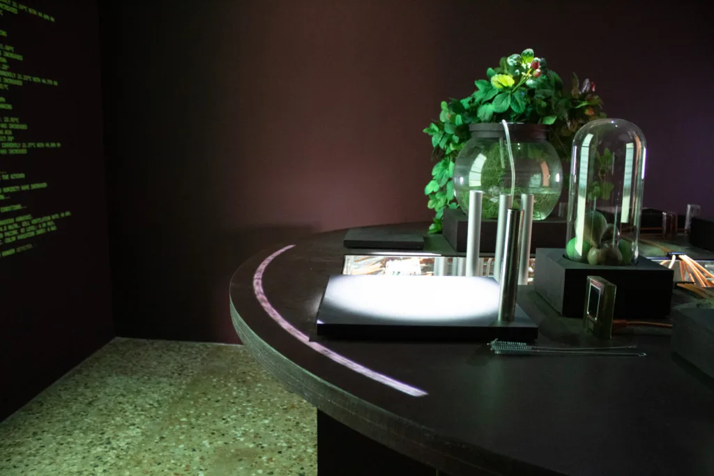 Continuously Becoming Home, detail. In contrast to the invisible efficiencies and technocratic slickness of the “smart home,” the installation foregrounds the productive messiness of entangled systems linking human life, data, and the biological world. It invites reflection on the environmental potential of these interactions and poses critical questions for design at the intersection of architecture, bio-design, and ambient computing—at a moment when human–AI relations and the accelerating climate crisis are reshaping what it means to dwell. Photo by Celestia Studio.
